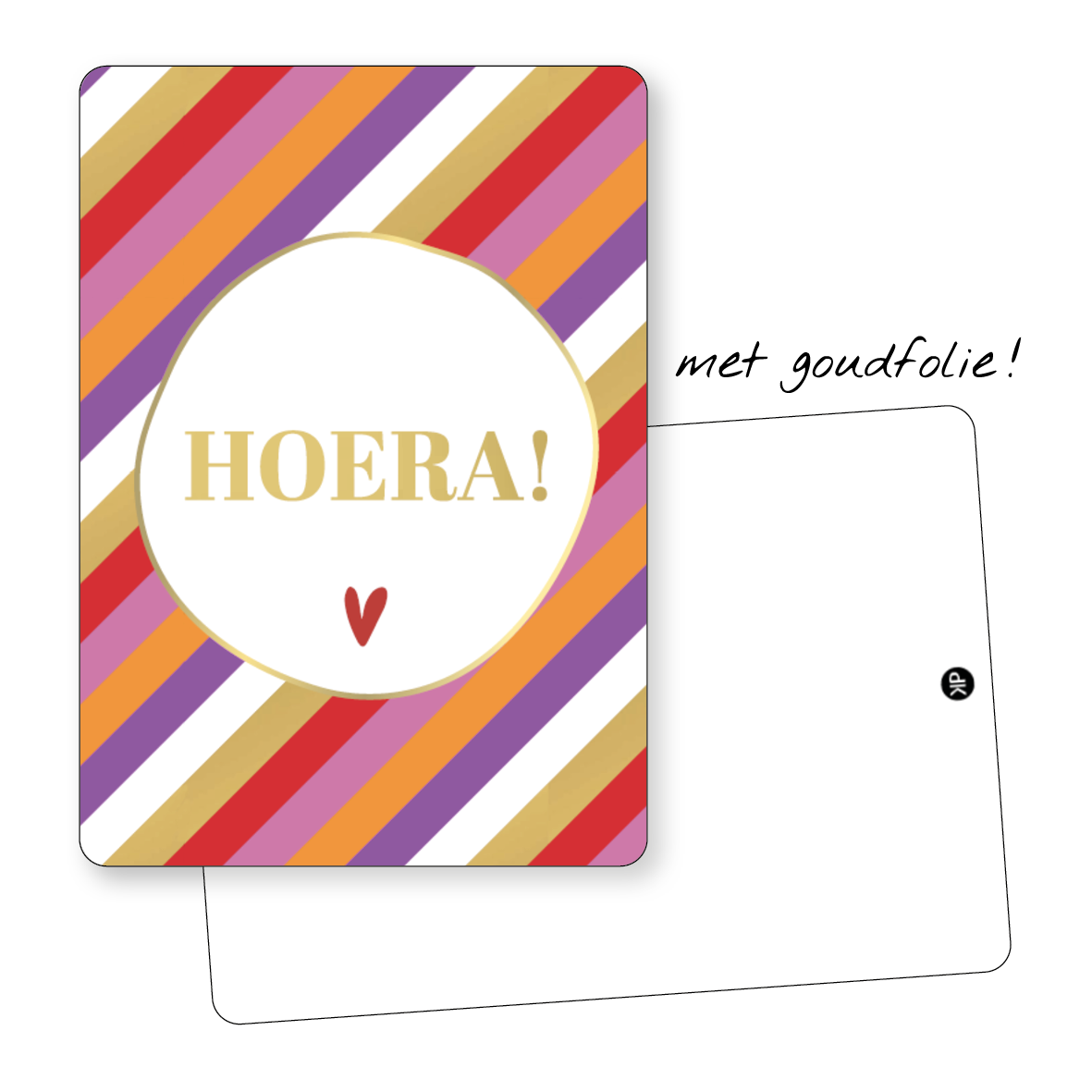 Deze A6 ansichtkaart van KP is van stevig, helder wit karton met een matte uitstraling. De luxe goudfolie details én afgeronde hoeken maakt het een uniek kaartje. Op de achterzijde is ruimte voor een persoonlijke verjaardagswens.